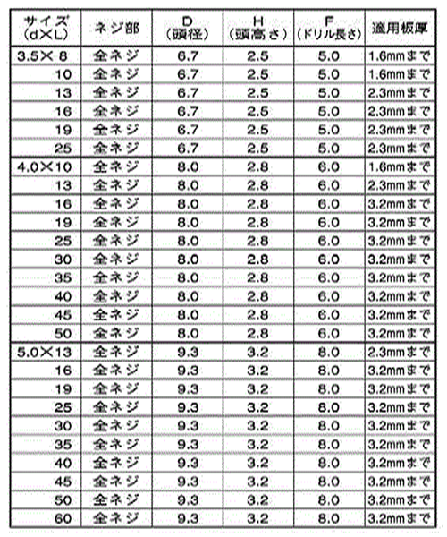 ・ねじの適用板厚はドリルの刃先の長さ(先端のテーパー部は不含)が最大板厚で刃先より厚い板厚は使用できず、最適長さは、刃先部分+3山を除いた有効長が目安です。(または、接合材料の厚み+刃先部分+5〜10mmnの長さ)