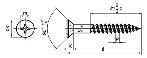 ねじの長さは全長(皿頭の場合、丸頭の場合は首下)の約2/3くらいです。