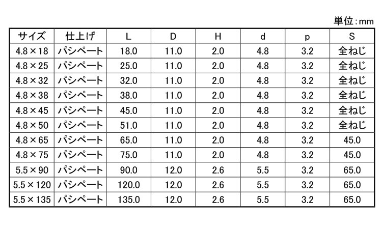 サイズ 表面処理 入数(単価:税込) ※最小販売条件:1小箱・袋〜 在庫