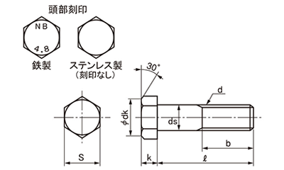 ステンレス 六角ボルト(半ねじ)(日本鋲螺製)