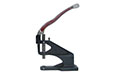 ・台座の浮いていない一段式のハンドプレス機です。一番小さいハンドプレス機(金手)の懐が6cm程度に対し、懐アームが11cmと深いので、大きめの布や革やシートにカシメやハトメやホック金具を取付ける際に便利です。