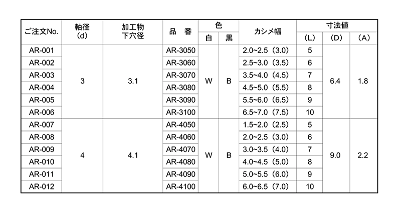 アルミ ARリベット なべ頭 (本体アルミ/ピン ナイロン製)(AR-B黒)(フジロック) の商品一覧