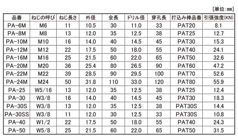 鉄 プラグアンカー(PA)(メネジタイプ・本体打込式)(ミリ・インチ)(AYファスナー)