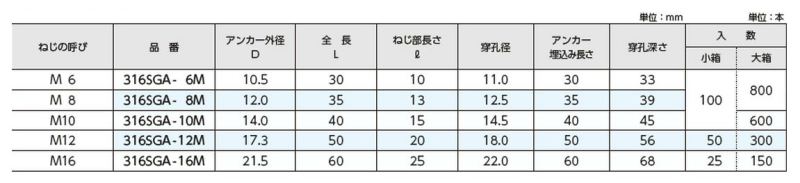 ステンレス SUS316 グリップアンカーSGA の商品一覧
