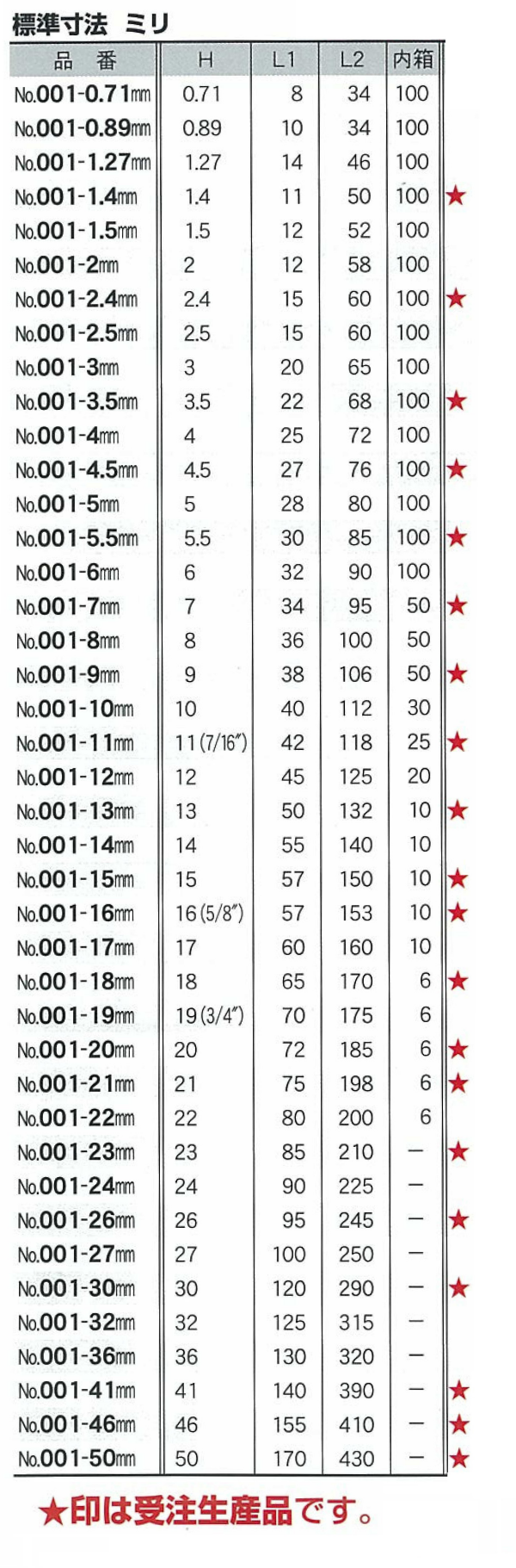 0.71mm / 0.9mm / 1.3mm / 1.5mm / 2mm / 2.5mm / 3mm / 3.5mm / 4mm / 5mm / 6mm / 7mm / 8mm / 10mm / 12mm / 14mm / 16mm / 17mm / 19mm / 20mm / 21mm / 22mm / 23mm / 24mm / 26mm / 27mm / 30mm / 32mm / 36mm / 41mm / 46mm