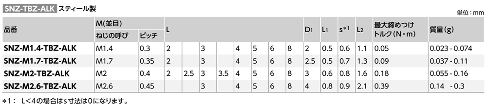 | SNZ-M1.4-4-TBZ-ALK-VA (M1.4 p=0.3) ピッチ=0.3 YN0013170014004000 |